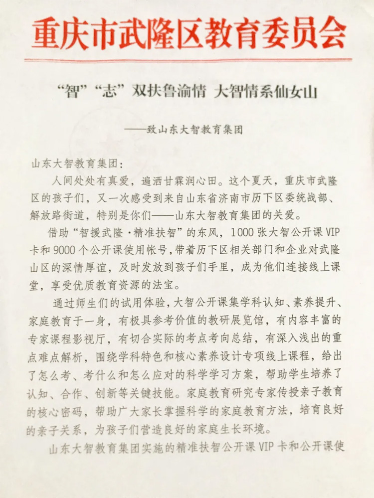 08月24日,重慶市武隆區(qū)教育委員會給大智寫來感謝信,就大智為武隆區(qū)學(xué)校公益捐贈大智公開課VIP卡表示感謝。為深入貫徹落實(shí)習(xí)近平總書記“扶貧...